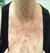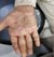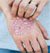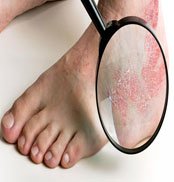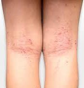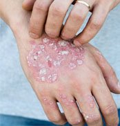 Psoriasis, patches of red, thickened skin with silvery scales develop, usually on the elbows, knees, scalp, and trunk. These areas can be itchy and painful. The disease may also affect the underarms and genital areas. Nails may become rough and pitted, and less commonly, a form of arthritis develops called psoriatic arthritis. Psoriasis can be a persistent problem, and tends to run in families. Psoriasis is associated with other serious conditions such as diabetes, heart disease and obesity.